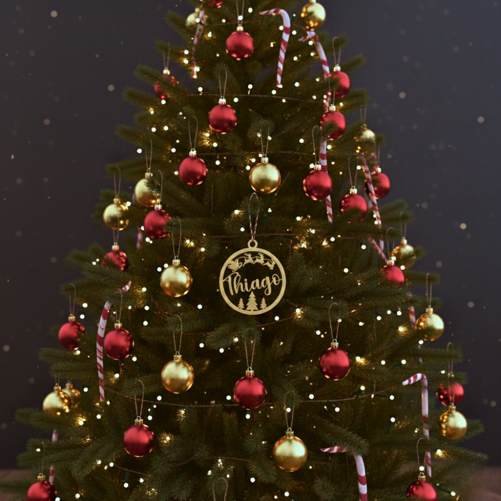 - Design iconico: slitta con renne, nome al centro, abeti alla base